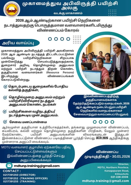 In order to effectively conduct and implement the various training courses planned to be conducted by the Management Development Training Unit in the year 2026, applications are invited from suitable resource persons with sectoral knowledge, professional experience and training conducting skills.